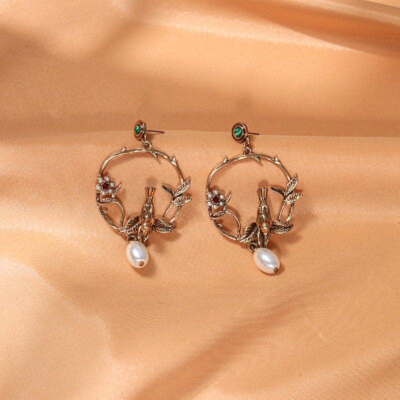 Vintage Kovové Geometrické Stereoskopické Vtáčikové Náušnice Vyrezávané Perlové S Príveskom