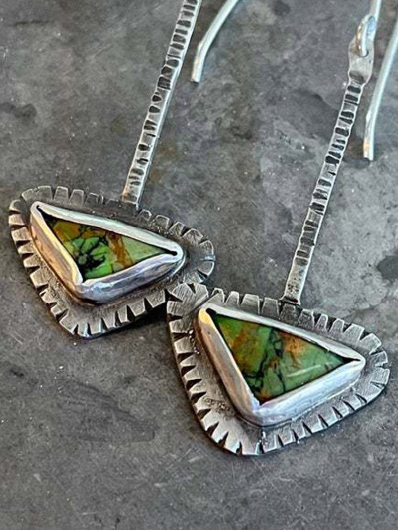 Vintage Náušnice S Vyrezávaným Okrajom Trojuholníkové Vykladané Tyrkysové Dlhé Zliatiny